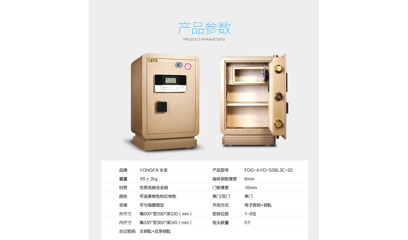 永發領君電子式保險箱D-53BL3C-02尺寸說明:600高*390寬*330深mm(含底座) 重量:69kg