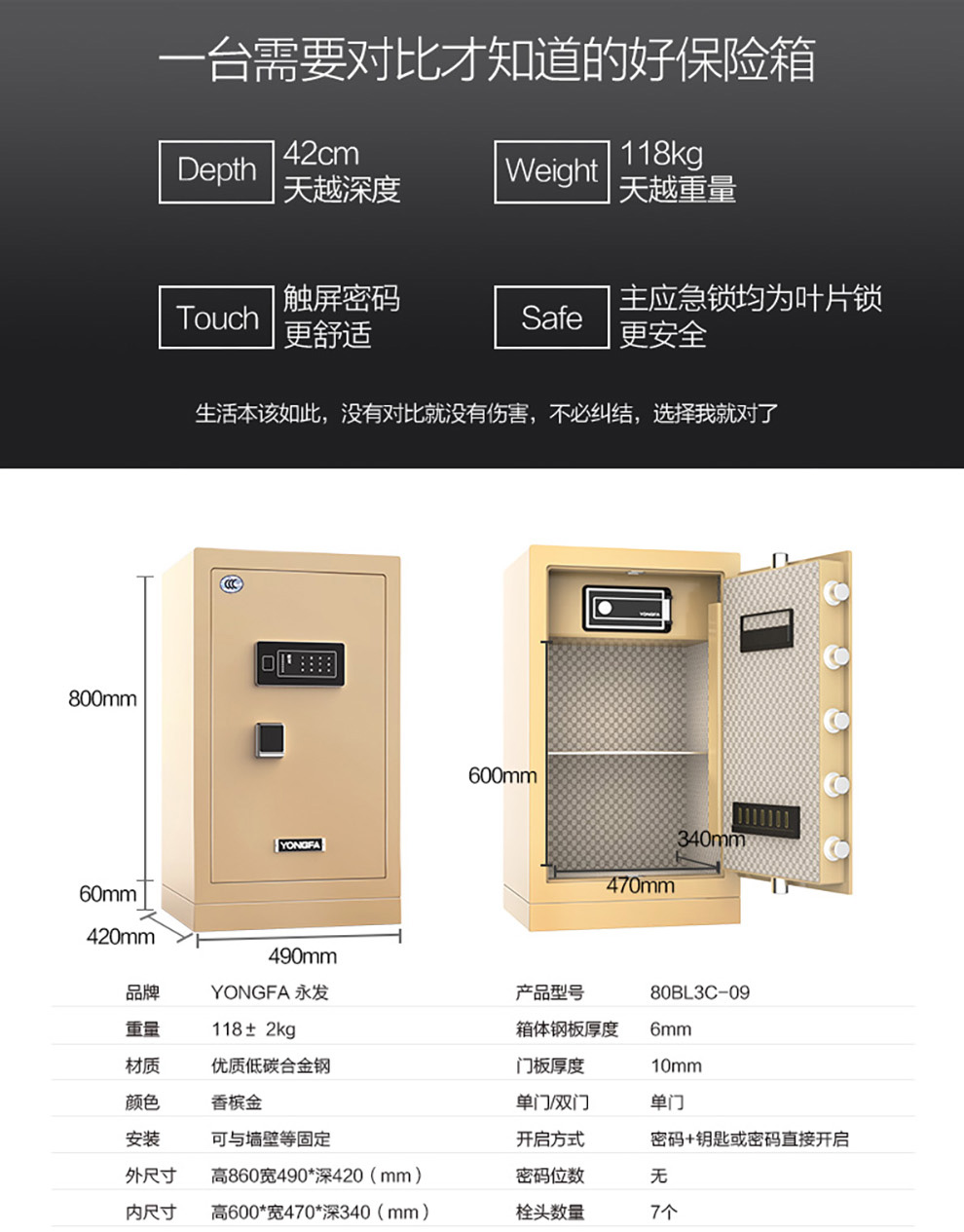 永發新品智瑞系列3C認證電子式保險柜80BL3C-09尺寸說明:860高*490寬*420深mm(含底座) 重量:118kg