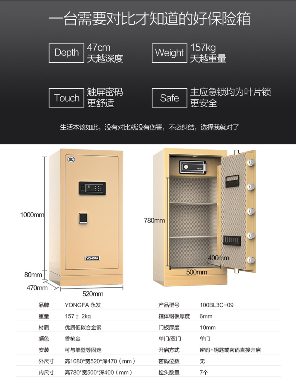 永發新品智瑞系列3C認證電子式保險柜100BL3C-09尺寸說明:1060高*560寬*470深mm(含底座) 重量:164kg