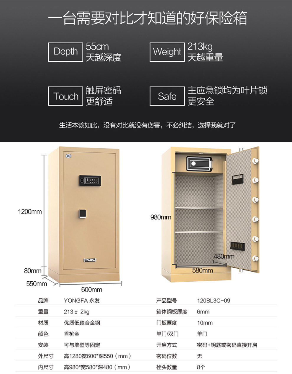 永發新品智瑞系列3C認證電子式保險柜120BL3C-09尺寸說明:1260高*600寬*550深mm(含底座) 重量:213kg