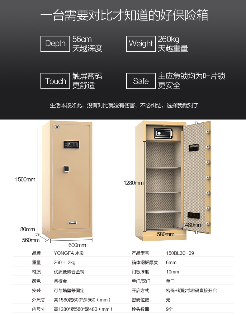 永發新品智瑞系列3C認證電子式保險柜150BL3C-09尺寸說明:1560高*600寬*560深mm(含底座) 重量:260kg