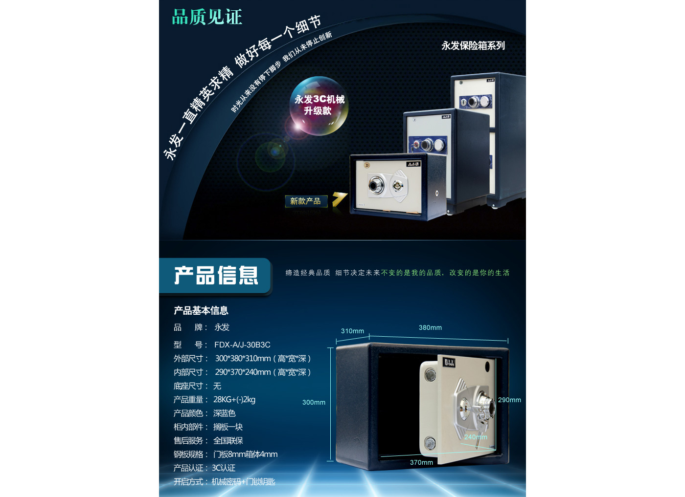 永發經典機械系列3C認證保險箱J-30B3C尺寸說明:300高*380寬*310深mm 重量:30kg